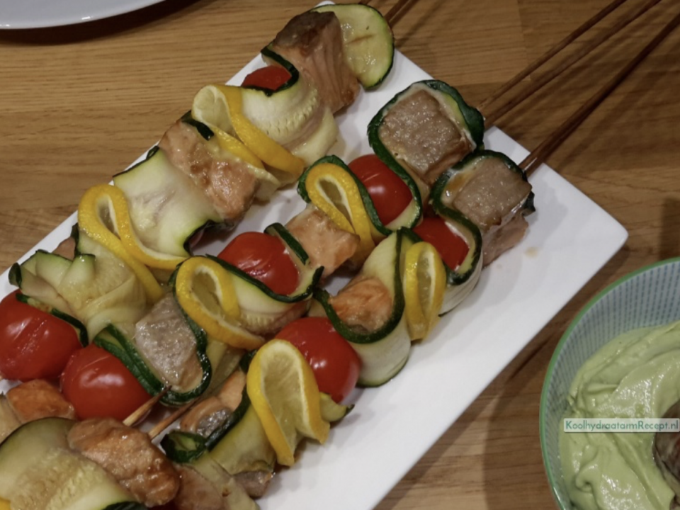 Gemarineerde zalm spiesen met avocadosaus